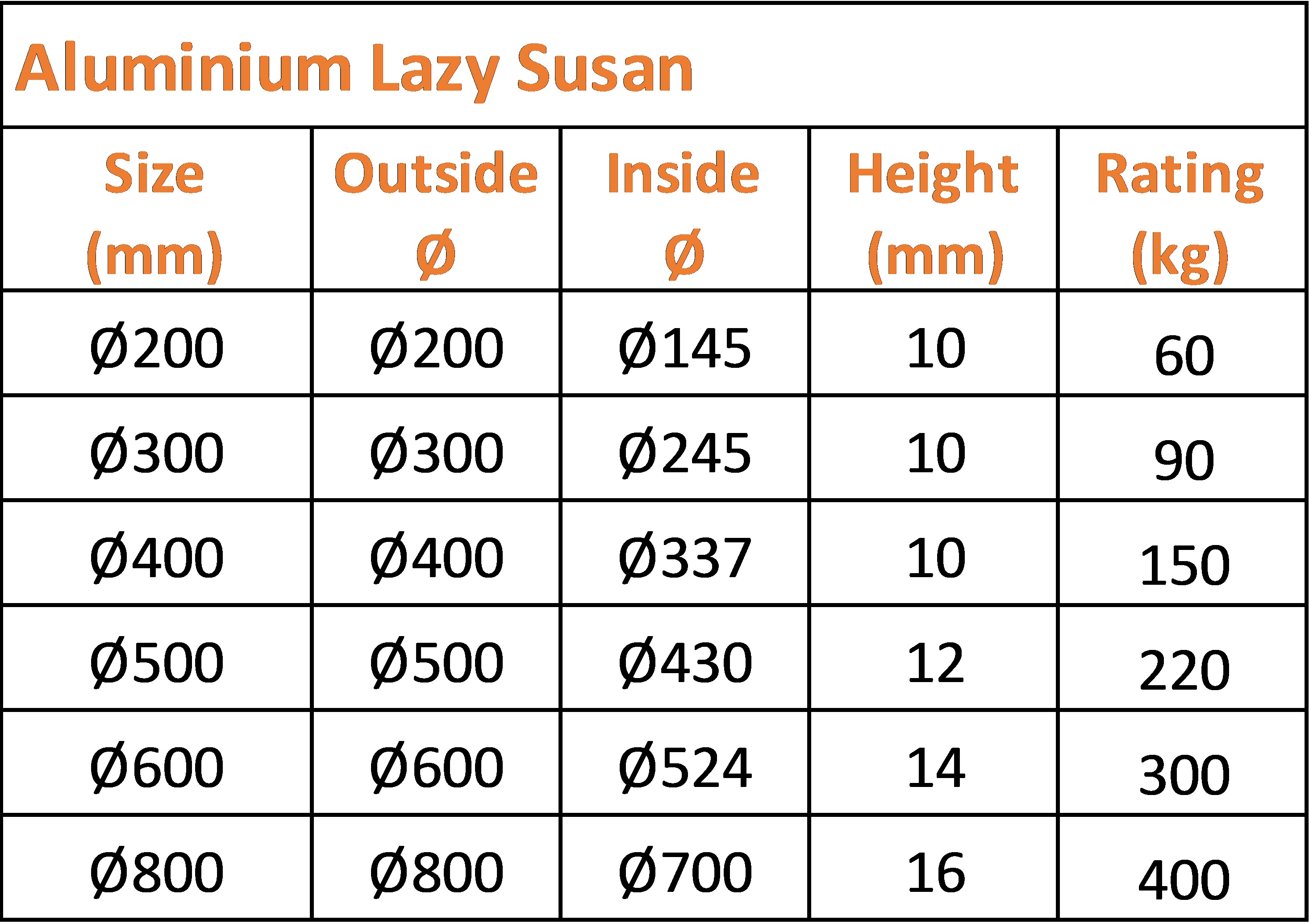 Lazy Susan Code #LSB-AlumSize: Ø200mm,Ø300mm,Ø400mm,Ø500mm,Ø600mm,Ø800mm / Material: Aluminium